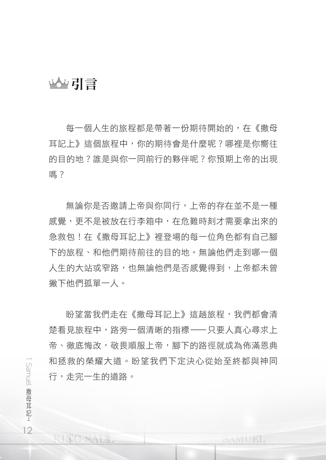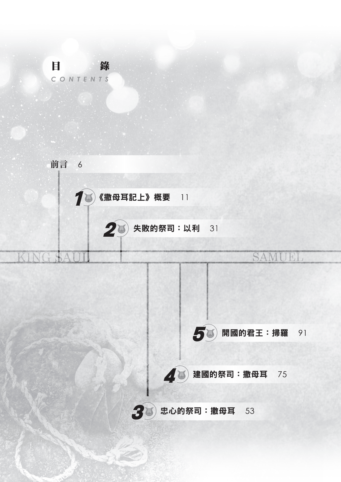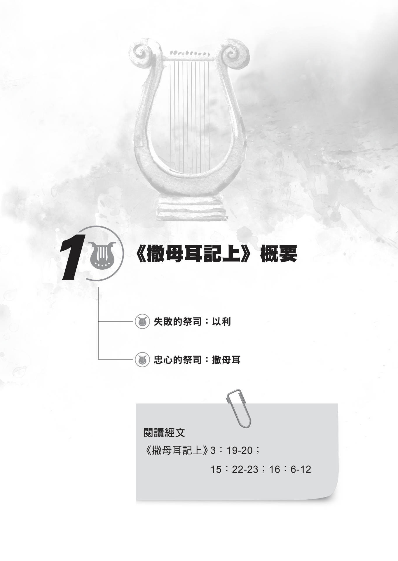 《撒母耳記上》這卷書,記述了以色列最後一位士師撒母耳,他身兼祭司和先知的職分,謙卑順服神,先後膏立了掃羅和大衛,幫助以色列民從偏行己路的士師時代,過渡到強盛的王國時代。