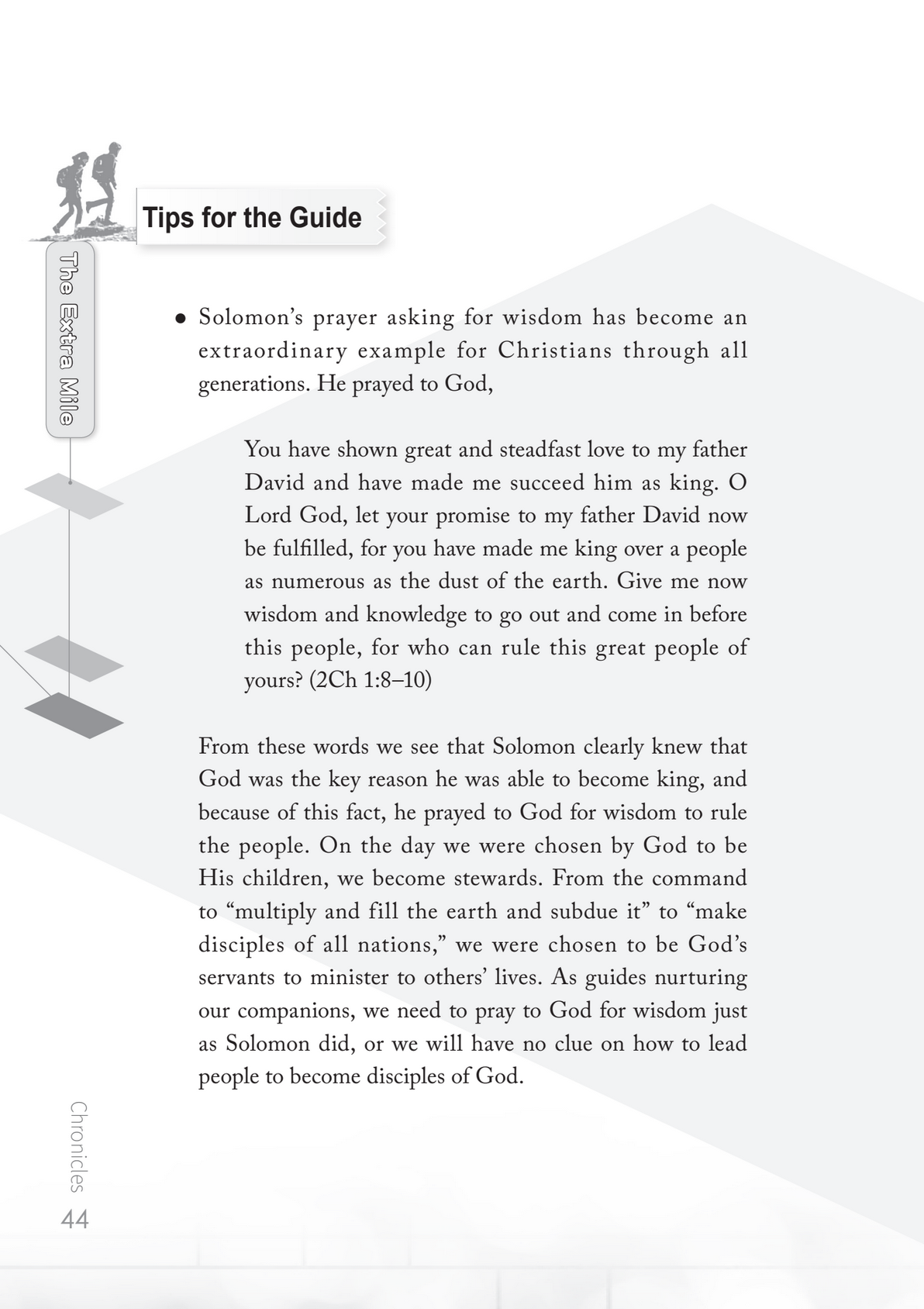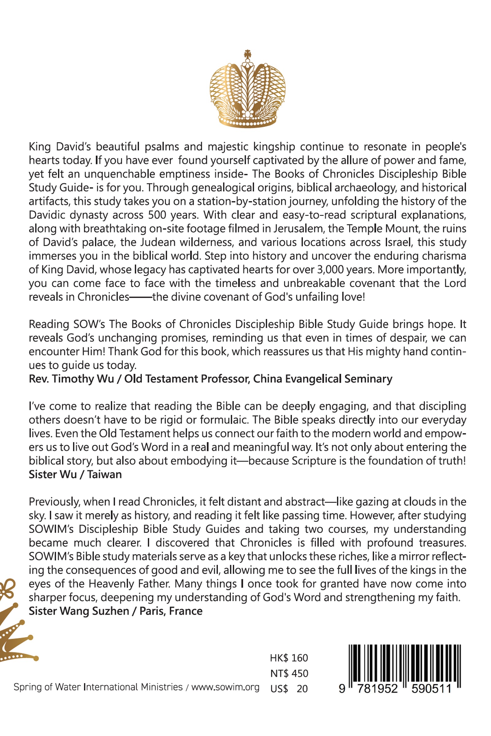 當我們一站一站隨著《歷代志門訓生命讀經》所記載的歷史和人物往前行,我們將逐漸體驗到無論外在的環境多麼艱難、我們的內心如何軟弱,神的應許永遠不會離開我們。只要我們願意從錯誤中悔改,回轉歸向神,神必定會用祂奇妙的作為再次復興我們。