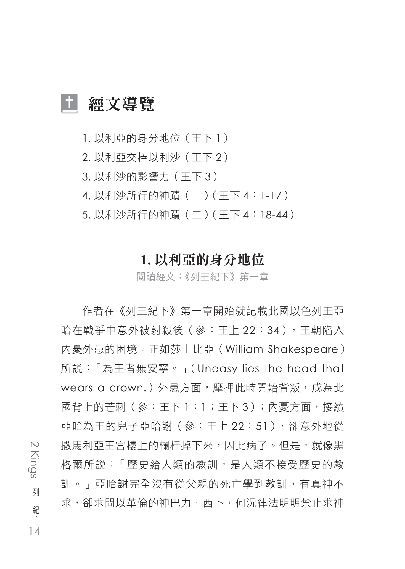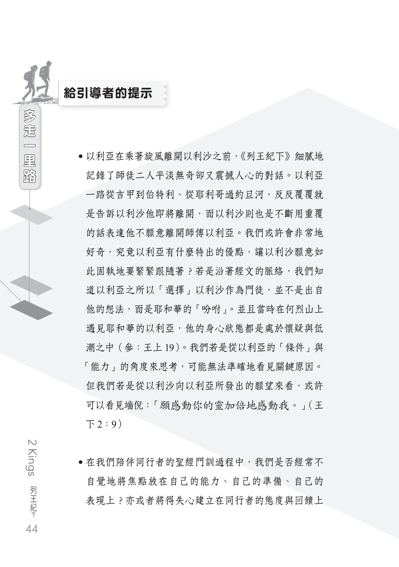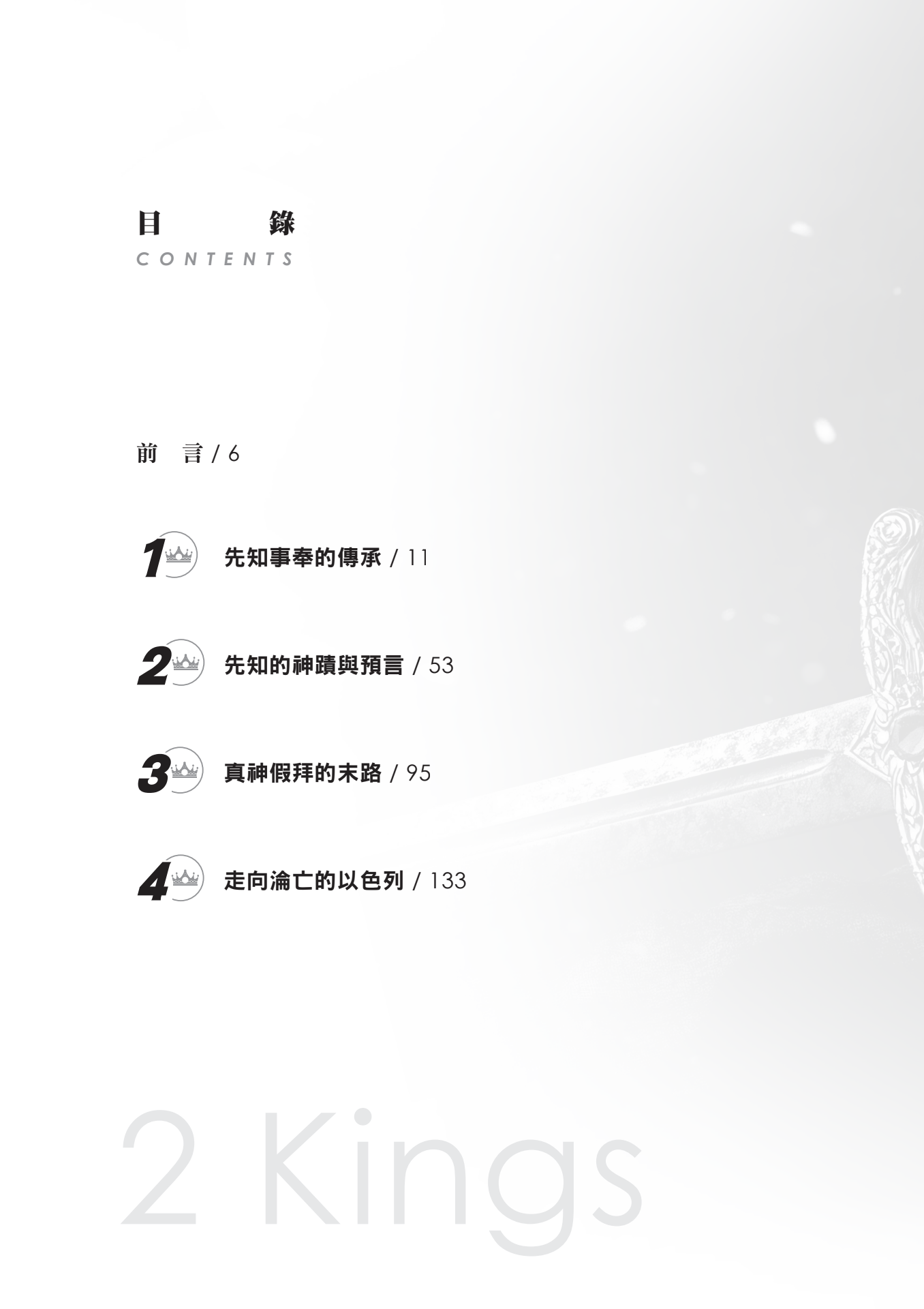 你手中這一本《列王紀下門訓生命讀經》,將帶領你一站一站地查考《列王紀下》的聖經經文,你將看到全書記載以色列國的歷史,從神祝福所羅門王,將聯合王國帶入強盛富裕的巔峰開始,卻在百姓、君王紛紛選擇對抗神的自信與愚昧中,將聯合王國拆毁為南國與北國的分裂和鬥爭;全書最後在北國、南國相繼遭列強併吞的悲慘命運中戛然而止。這段令人感傷又充滿詭譎的歷史,將打開你的眼睛,看見君王與先知、猶大國與以色列國,在《列王紀下》所記錄的歷史舞台上演繹著一場驚心動魄的對決。以色列的先知奉神差遣,在君王面前揭開了上帝的神諭,也在人間敲響了警示的鐘聲。