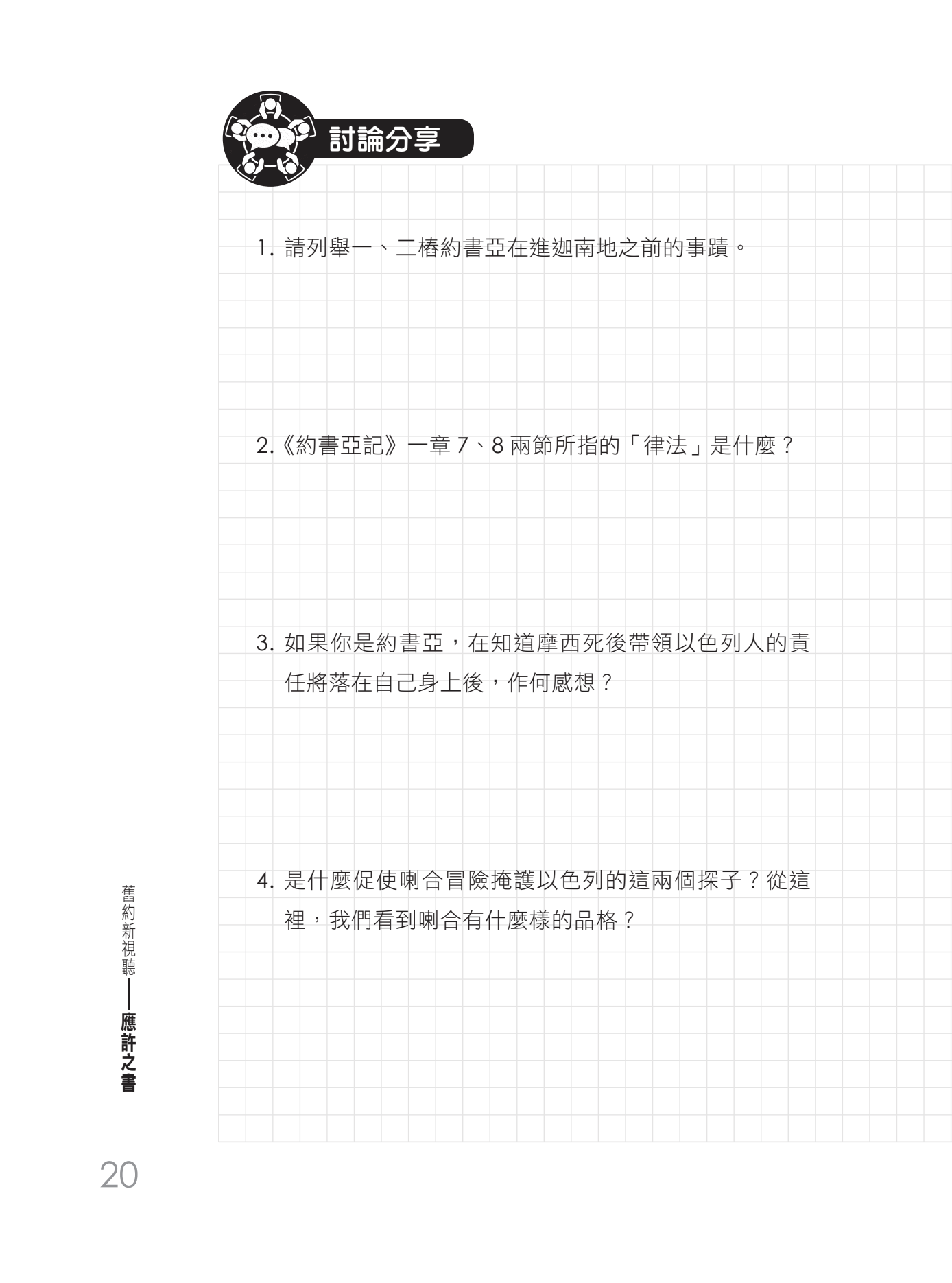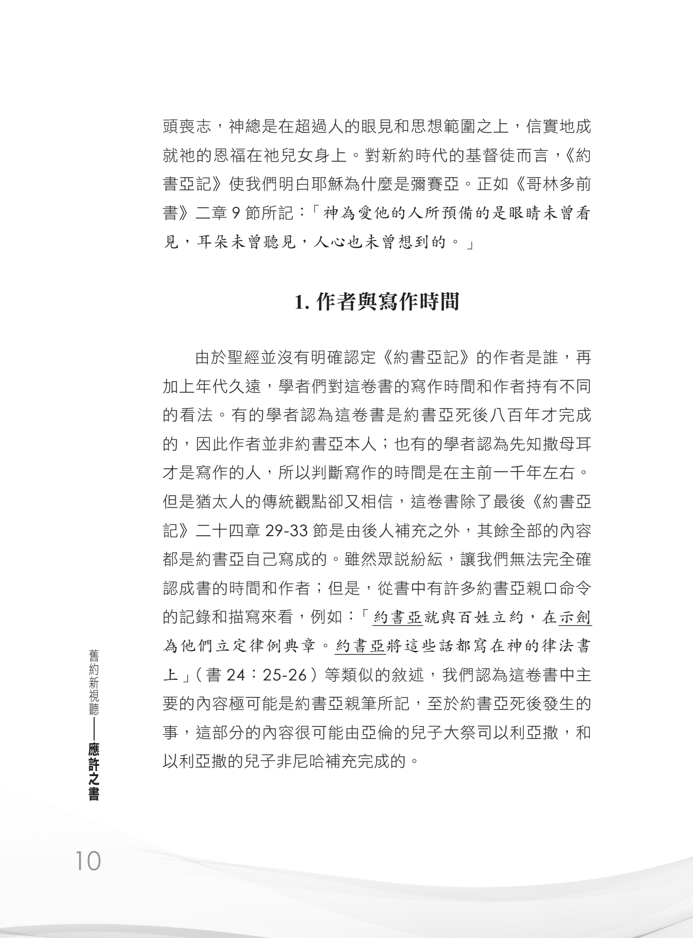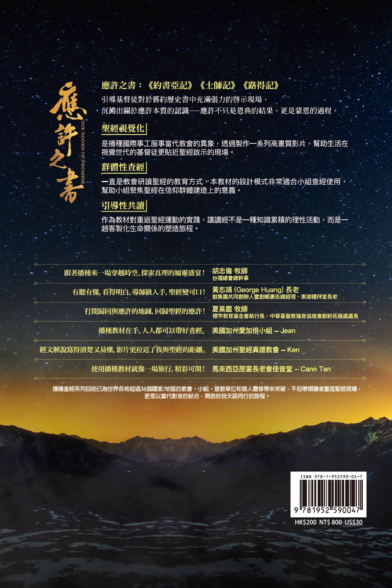 《舊約新視聽-應許之書》是將播種國際事工所發行的《約書亞記》、《士師記》和《路得記》的查經教材經過重新的編排,集結成冊,共有十三站,成為小組查經或是主日學一整季的查經內容。每一站的影片都有前情摘要、經文講解和觀影分享,長度是 25 分鐘。各單元的研習手冊都有完整的經文解説和討論問題。每次在看完影片之後,透過手冊中的討論問題,使每一站的學習都能「身臨其境」。我們希望這些豐富的內容,經過整齊的編排,可以幫助小組查經和主日學上課的時間都能夠充份掌握,使每一站的經文學習都有最佳的果效。