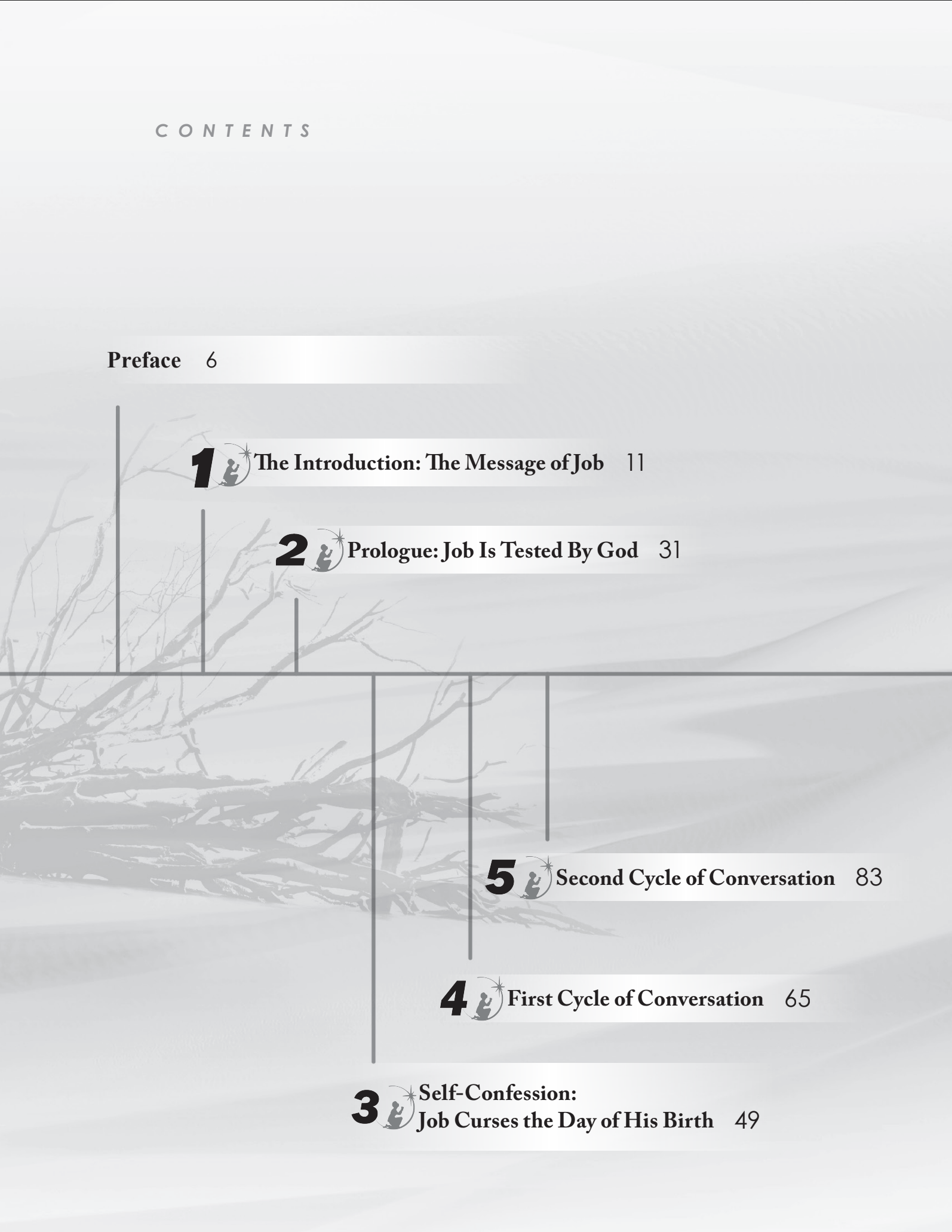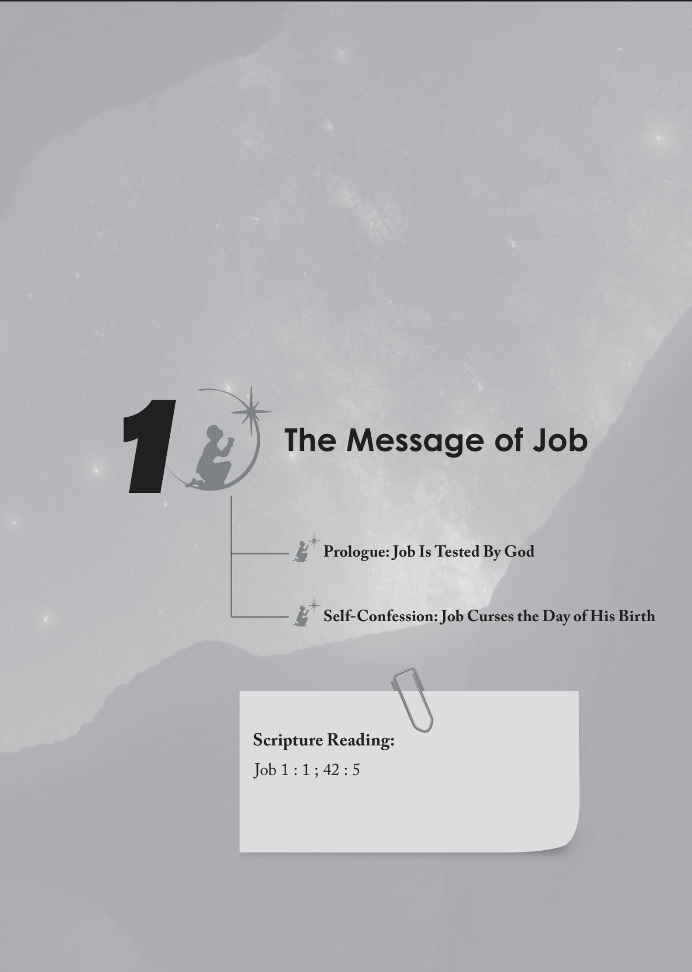 完全正直又敬畏神的約伯失去了一切,在極度痛苦中他曾自以為義、憤怒不滿,直到他明白神創造宇宙天地萬物,擁有一切的主權和完全的智慧與慈愛公義。因此約伯看清自己的無知和驕傲,終於在神面前謙卑懺悔。